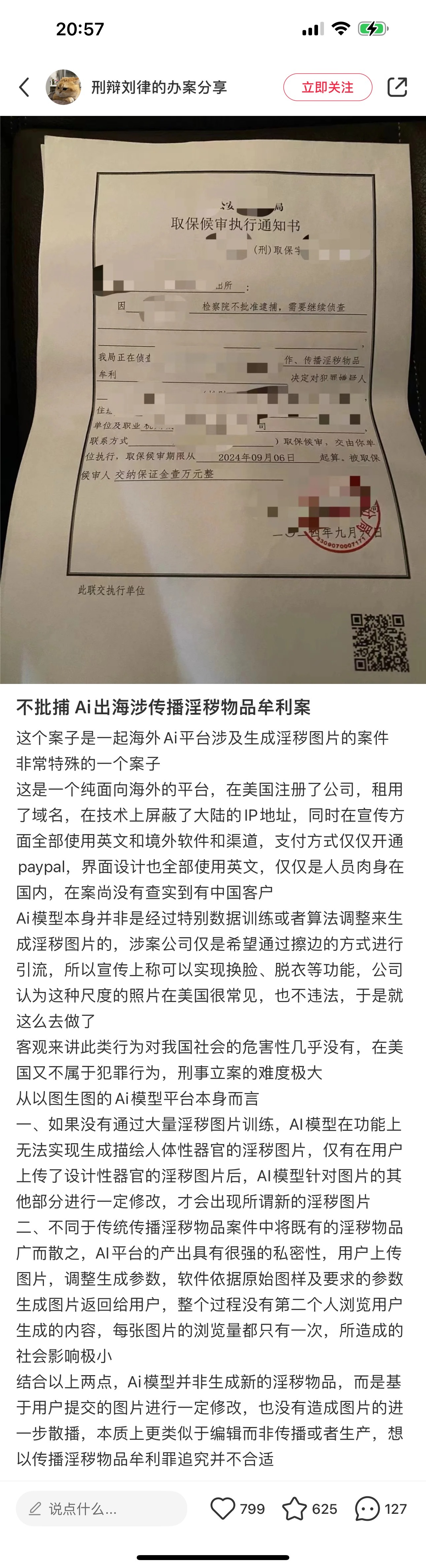 几个中国人用开源的SD调了自己的模型,建了英文站提供付费改图服务(去年以来很多这样曲线出海的AI工具站),可以让用户把自己上传人物图片变成色图,被逮了但律师把人捞了出来,对法条的解释有理有据很是严谨哈哈哈