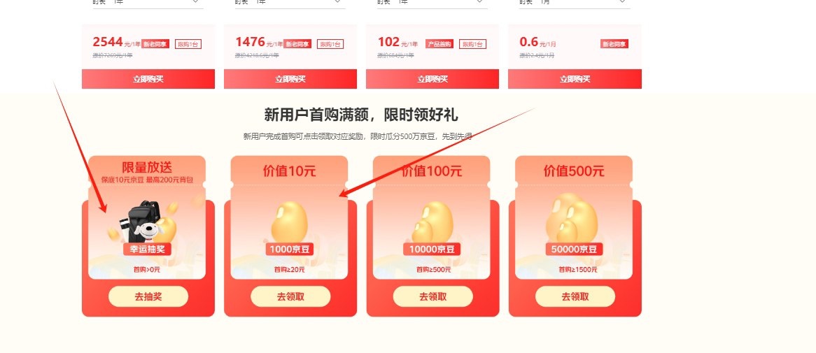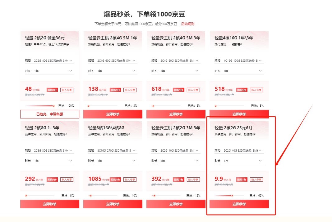 【每天0点和12点刷新库存,先打开页面登录上】选25元6个月的2核2G服务器,服务器可以做穿透,sign用,然后去页面底部两个地方保底领取两千京豆, 有概率抽到2500/4000京豆。